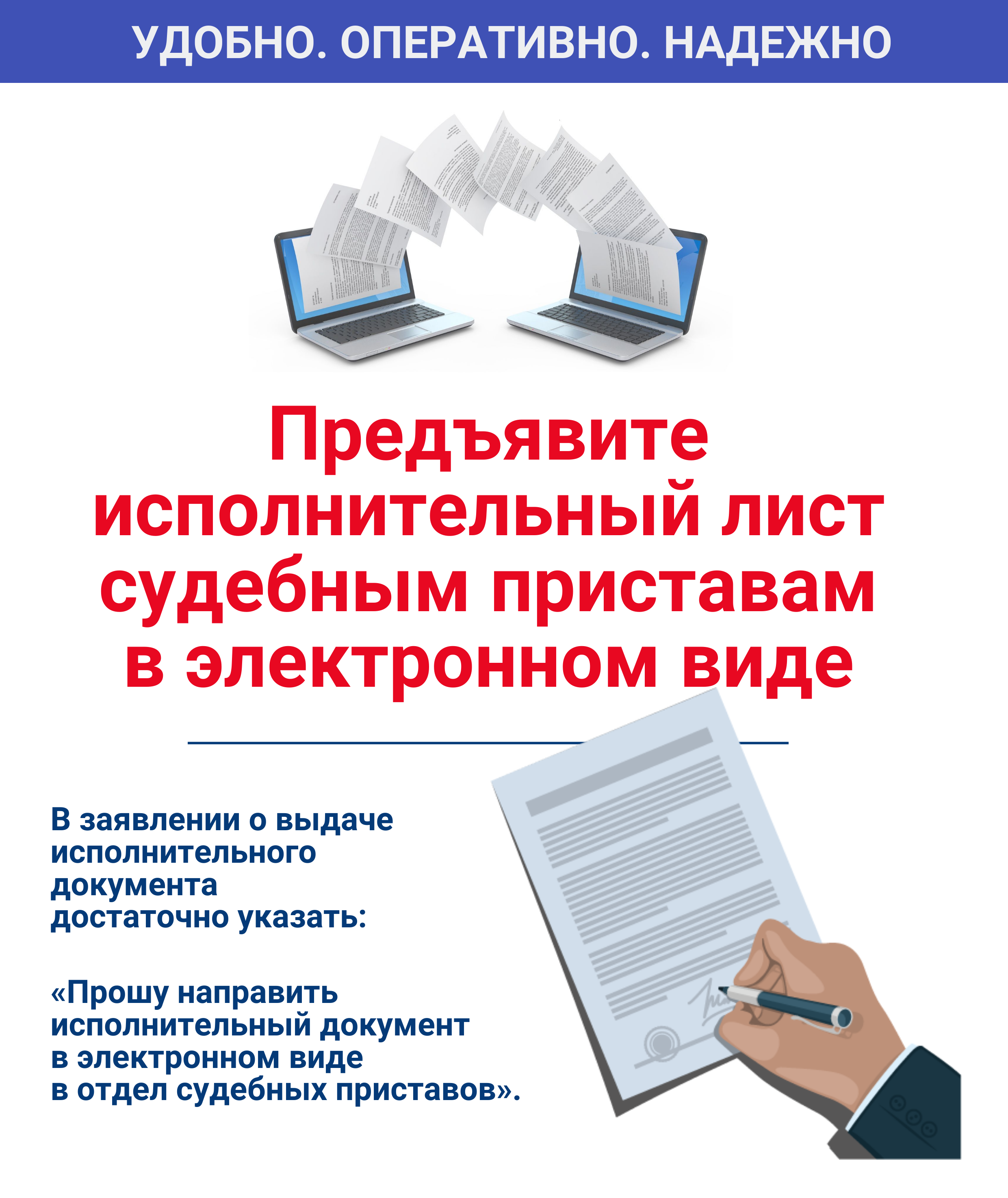 В Кунашакском районном суде Челябинской области организовано электронное взаимодействие по направлению на принудительное исполнение исполнительных документов в электронной форме в соответствующую службу судебных приставов, для этого в заявлении о выдаче исполнительного документа достаточно указать: "Прошу направить исполнительный документ в электронном виде в отдел судебных приставов".